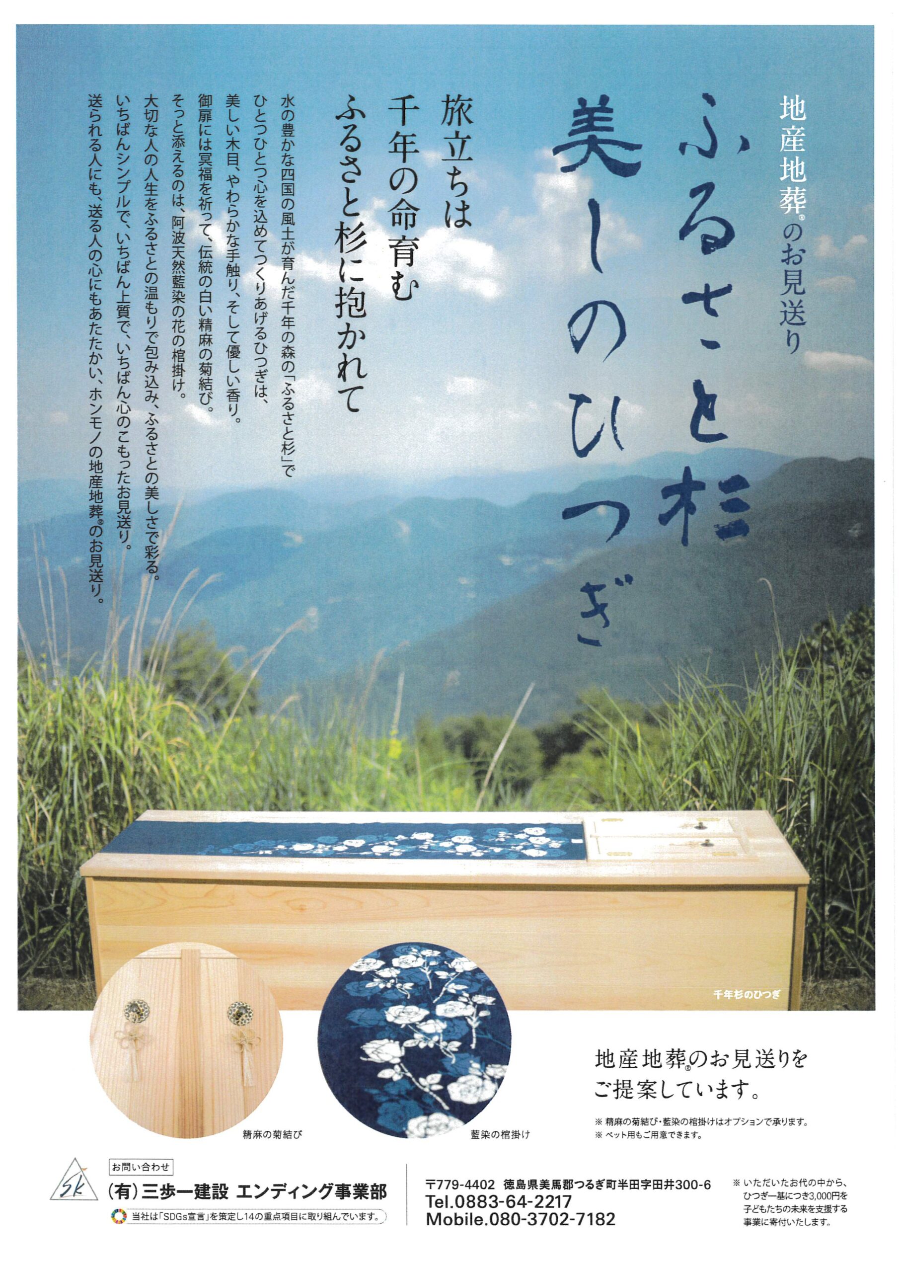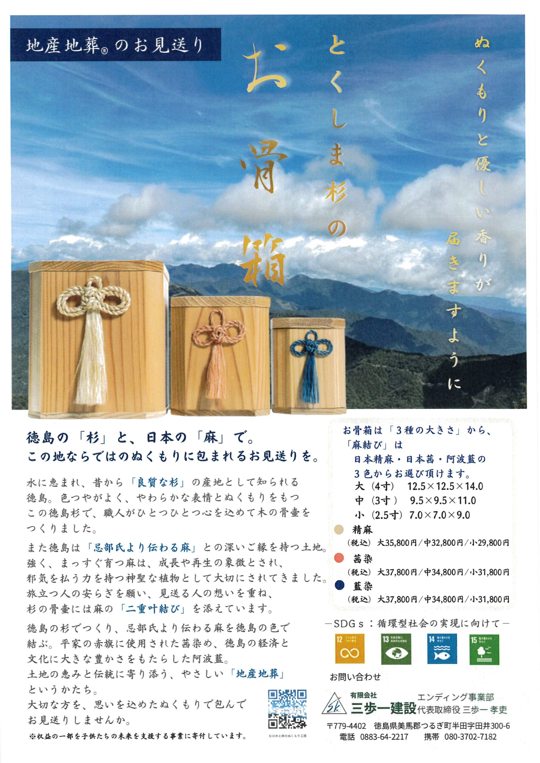 有限会社三歩一建設がこころを込めてつくっている、とくしま杉のお骨箱とひつぎを紹介します。